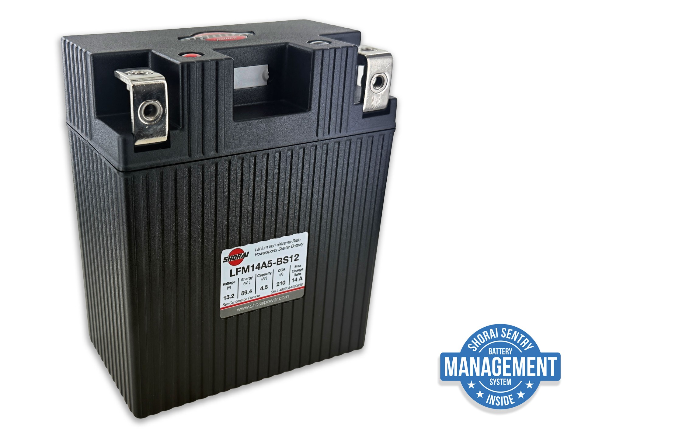 SHORAI Lithium-Iron (LiFePO4) Powersports battery w/BMS, 4.5Ah 13.2V, "A" polarity, Case Type 5, Length 5.28" Width 3.15" Height 6.30". Shorai Batteries require a charging system output of 13.1 Volts or higher at idle, and must not exceed 15.2 volts at maximum output.
