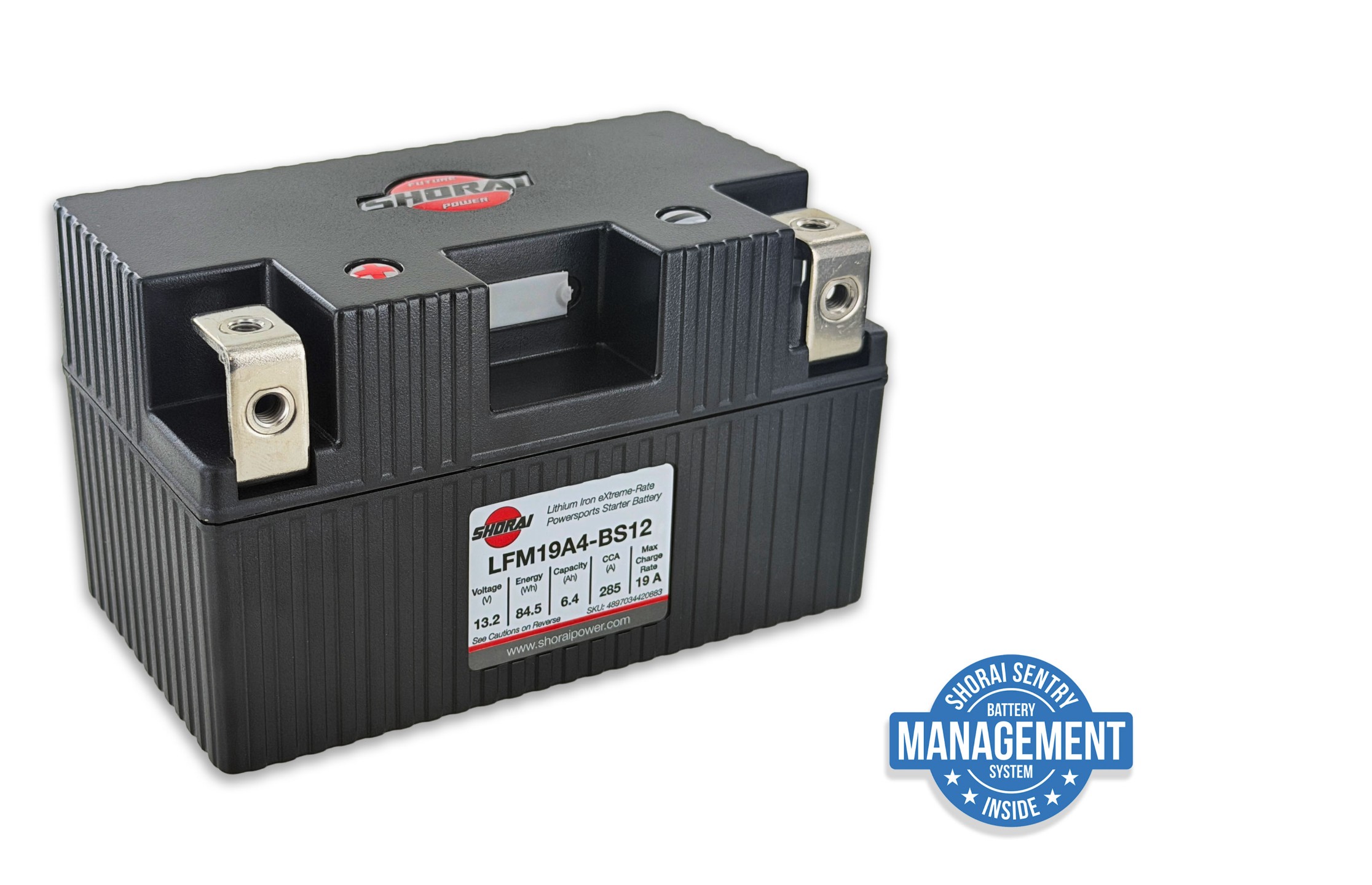 SHORAI Lithium-Iron (LiFePO4) Powersports battery w/BMS, 6.4AH 13.2V, "A" polarity, Case Type 4, Length 5.83" Width 3.39" Height 3.46". Shorai Batteries require a charging system output of 13.1 Volts or higher at idle, and must not exceed 15.2 volts at maximum output.