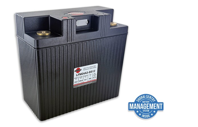 SHORAI Lithium-Iron (LiFePO4) Powersports battery w/BMS, 8.0Ah 13.2V, "A" polarity, Case Type 3, Length 6.55" Width 3.39" Height 6.10". Shorai Batteries require a charging system output of 13.1 Volts or higher at idle, and must not exceed 15.2 volts at maximum output.
