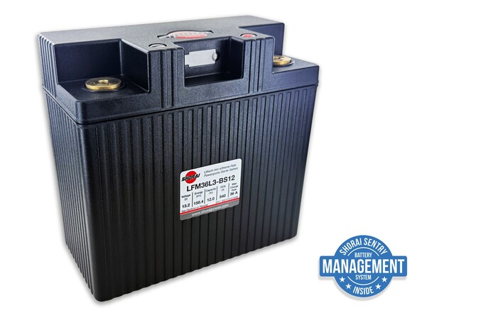 SHORAI Lithium-Iron (LiFePO4) Powersports battery w/BMS, 12.0Ah 13.2V, "L" polarity, Case Type 3, Length 6.55" Width 3.39" Height 6.10". Shorai Batteries require a charging system output of 13.1 Volts or higher at idle, and must not exceed 15.2 volts at maximum output.