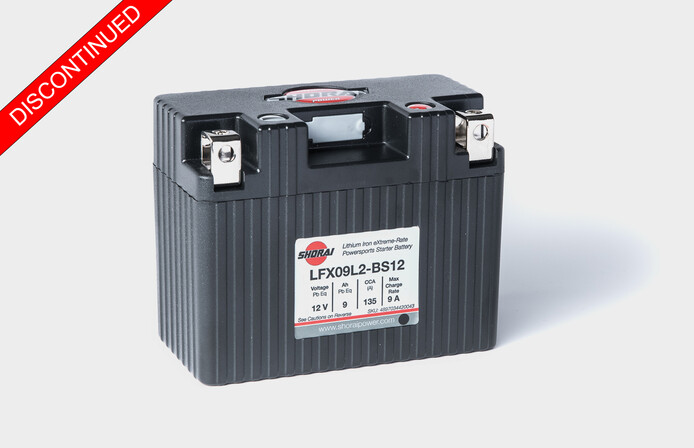 SHORAI LFX Lithium-Iron Powersports battery, 9Ah PbEq 12V eq, "L" polarity, Case Type 2 Length 4.45" Width 2.28" Height 3.50" Shorai Batteries require a charging system output of 13.1 Volts or higher at idle, and must not exceed 15.2 volts at maximum output.