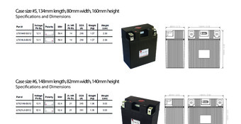 SHORAI LFX Lithium-Iron Powersports battery, 24Ah PbEq 12V eq, "A" polarity, Case Type 3 Length 6.55" Width 3.39" Height 6.10" Shorai Batteries require a charging system output of 13.1 Volts or higher at idle, and must not exceed 15.2 volts at maximum output.